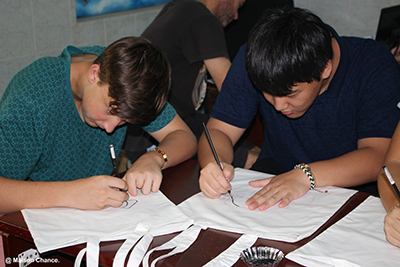 Một nhóm học sinh vẽ tranh trên túi vải với sự giúp đỡ của hai họa sỹ phòng tranh: Anh Chiến và Anh Lộc.