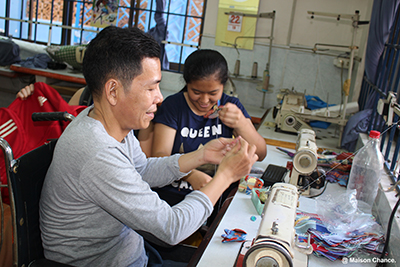 Trong khi đó nhóm còn lại dưới sự hướng dẫn của các thành viên khuyết tật tại phòng may đã học cách làm các móc khóa với con thú nhồi bông.