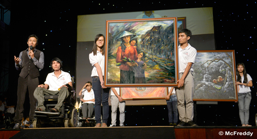 Ngày này, một hàng các em nhỏ của Nhà May Mắn đứng chào đón khách mời bằng những tràng pháo tay. Chúng tôi cũng thiết lập ba đường ram nhằm cho phép những người ngồi xe lăn có thể lên xuống. Những chiếc giỏ xách và những sản phẩm khác của phòng may và phòng mỹ nghệ tre cũng được trưng bày ngay lối vào nhằm giới thiệu công việc của chúng tôi. Chúng tôi cũng bán đấu giá im lặng cho tất cả các bức tranh được đặt ở lối vào. Hầu hết các hoạ sĩ của chúng tôi được nhóm lại xung quanh các tác phẩm của họ. Họ quan sát, vui cười, những vị khách mời ghi giá bức tranh của mình và bỏ vào thùng. Một bữa tiệc buffet đã được chuẩn bị bởi các em ở nhà hàng và phòng bánh của Làng May Mắn. Tôm nướng, cá hồi, cá xiên dưa chuột, thịt xiên que…Tất cả các món ăn này được dùng cùng một ly rượu vang. Những em phục vụ không ai khác chính là các em thanh thiếu niên của Nhà May Mắn. Buổi lễ được bắt đầu với một cuộc họp báo vào khoảng 17h. Tim, nhưng dĩ nhiên cũng có một số thành viên của Nhà May Mắn đã trả lời các câu hỏi của các nhà báo.