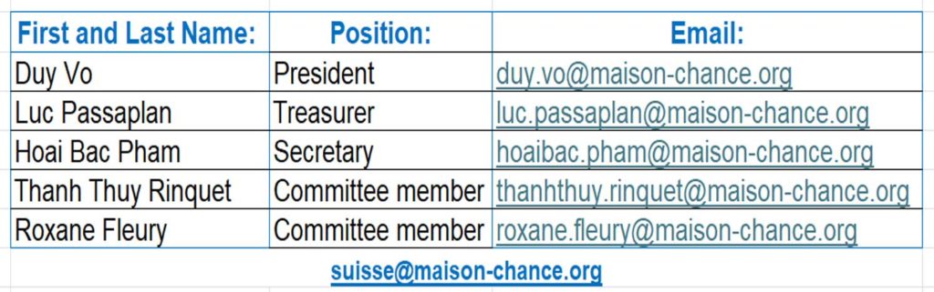 The association Maison Chance Switzerland was created in 1996. Resources of the association come from: