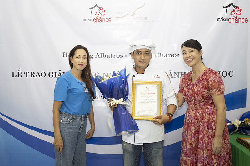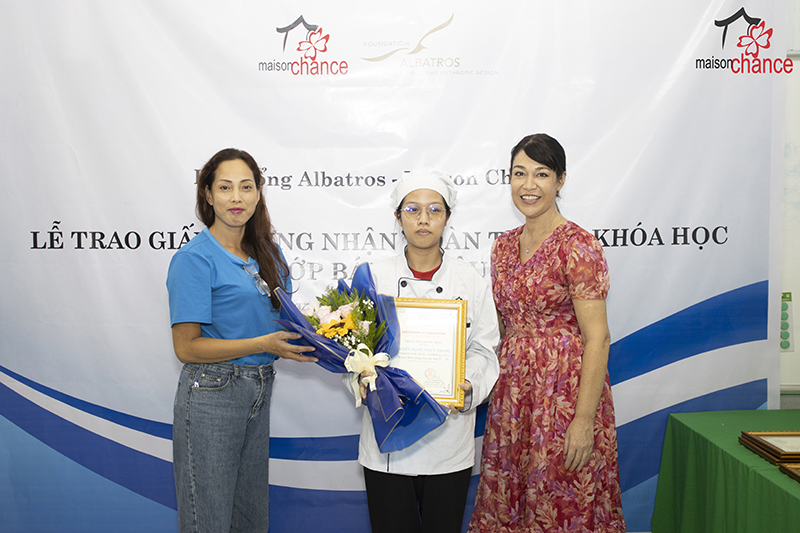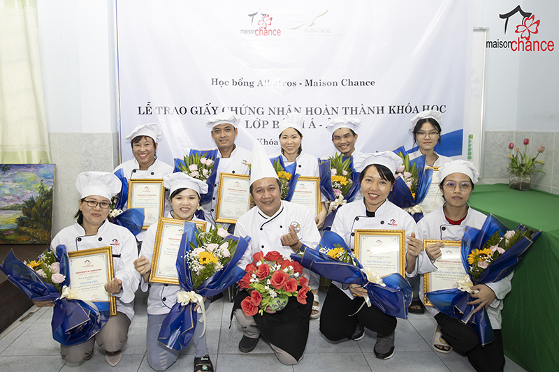 The second-course baking training program for disadvantaged youth has ended successfully. The certificate awarding ceremony took place in a joyful atmosphere, with honor guests, Maison Chance representatives, and all trainees in attendance.