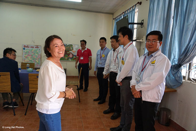 Buổi gặp gỡ diễn ra trong bầu không khí ấm cùng và thân mật. Bà Trương Thị Kim Chi, phó giám đốc Nhà May Mắn giới thiệu với đoàn quá trình hình thành và hoạt động của trung tâm. Sau đó, đoàn thăm trường học, nhà mẫu giáo, phòng bánh tại Làng.