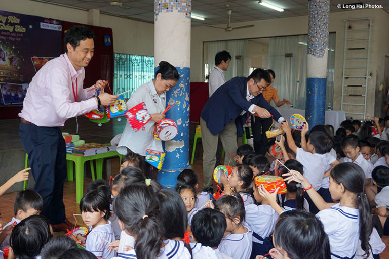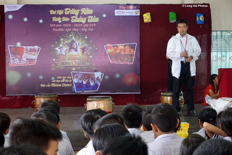 Để bắt đầu chương trình, các vị đại diện Tập Đoàn Aeon đã có bài phát biểu trước các em học sinh, chào hỏi và chúc mừng các em dịp Tết Trung Thu. Đoàn đã dành cho các em nhiều tình cảm và những phần qùa ý nghĩa.