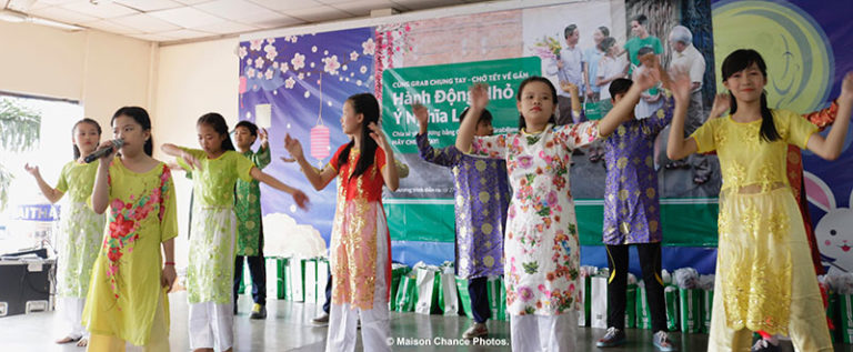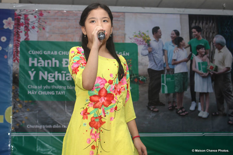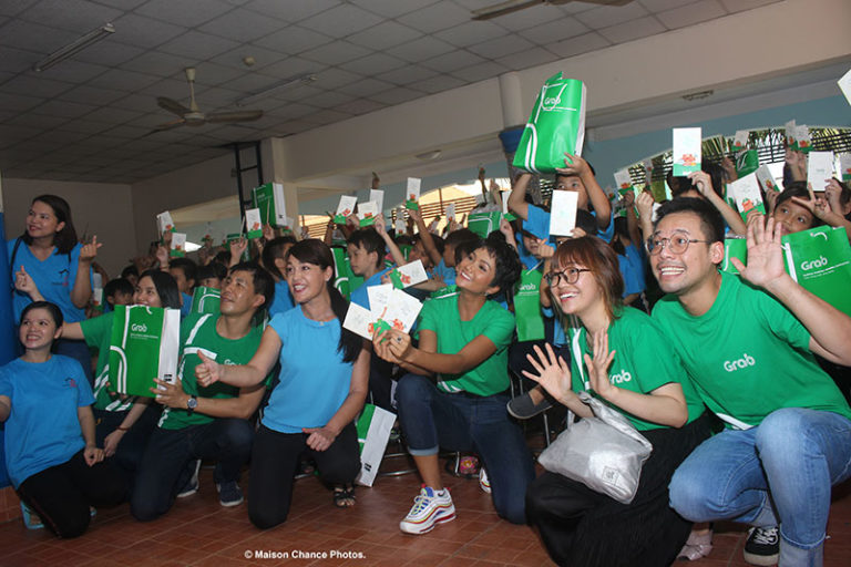 Từ đầu giờ chiều, học sinh trường tiểu học Làng May Mắn đã có mặt tại hội trường để chào đón đại diện Công ty TNHH Grab. Đây là lần thứ hai Maison Chance nhận được sự hỗ trợ từ Grab. Trước đó, công ty đã hỗ trợ trường mua thêm bàn ghế mới cho các lớp học, đồ chơi cho học sinh khối mẫu giáo và sửa lại một phần tường bị hư hại.