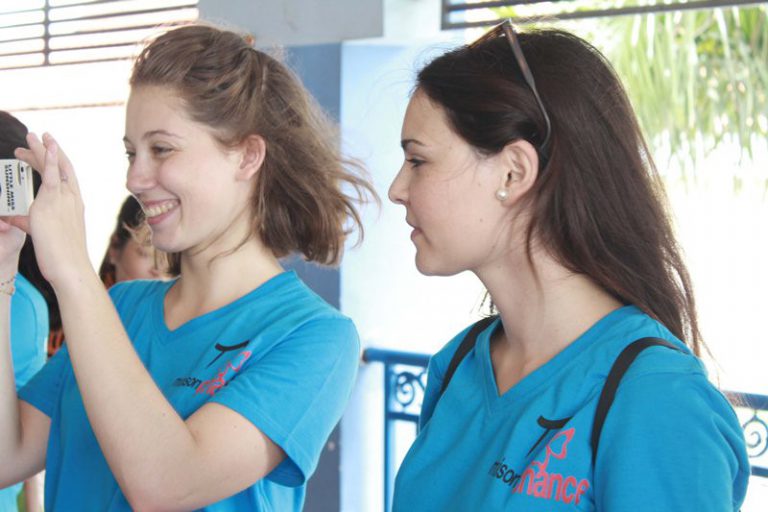 Nụ cười của những cô gái nước ngoài có tấm lòng với Việt Nam. Các bạn trẻ này đang ở trung tâm Chắp cánh, hàng ngày chăm sóc các em nhỏ mồ côi và người khuyết tật.