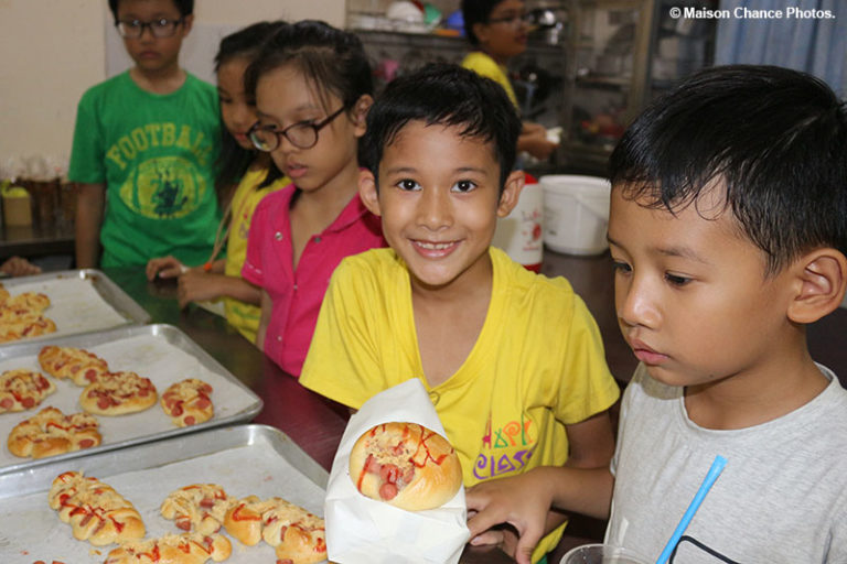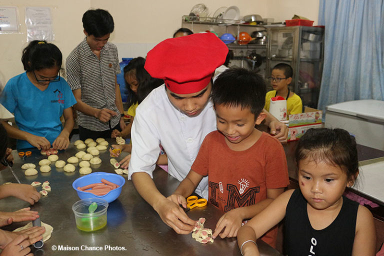 Tiếp đó, xe bus của Maison Chance đã đưa mọi người đến Làng May Mắn. Đầu tiên các thành viên Happy Class được đưa đến xưởng bánh. Đầu bếp của chúng tôi hướng dẫn các em nhỏ trong đoàn nướng bánh Âu. Trong thời gian chờ đợi, các em giao lưu bóng rổ với học sinh trong làng tại sân chơi và có những pha ghi bóng đẹp mắt.