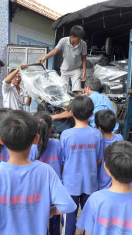 Cách đây vài ngày, hai xe tải chở đầy xe lăn nhập khẩu về từ Canada, tất cả đã đến sân của Làng May Mắn. Các thành viên Nhà May Mắn rất vui vẻ cũng như hớn hở chào đón những chiếc xe lăn mới. Các em nhỏ ùa đến để hỗ trợ dỡ hàng xuống từ xe tải 34 xe lăn bao gồm một xe lăn điện.