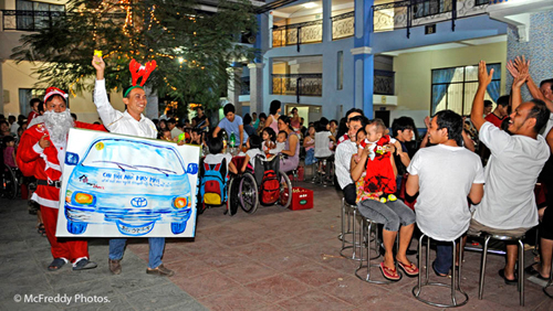 Dĩ nhiên cũng có những món quà để chia sẻ, điều này có nghĩa rằng ông gia Noel là một số người trong chúng tôi, mặc dù trang phục không phù hợp với nhiệt độ nóng và ẩm của Việt Nam. Tất cả mọi người đã tập trung để làm cho các em nhỏ vui vẻ với tinh thần chia sẻ Giáng Sinh. Sau các trò chơi, các em nhỏ tụ tập lại để làm đoàn xe nai cùng anh tài xé của chúng tôi!
