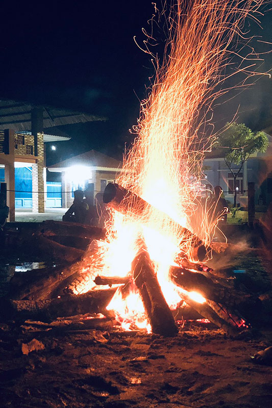 Tối đó, chúng tôi đã tổ chức một đêm lửa trại với tất cả thành viên Happy Class và các em nhỏ đang sống tại trung tâm. Trong ánh lửa bập bùng, chúng tôi nướng bắp, gà vườn và cá bắt được ở ao chiều hôm đó. Nhóm cùng thưởng thức bữa ăn và hát karaoke tại hồ trái tim ở giữa Trung Tâm.