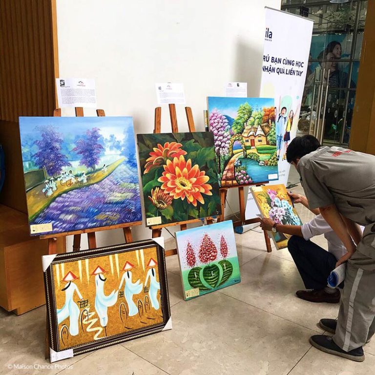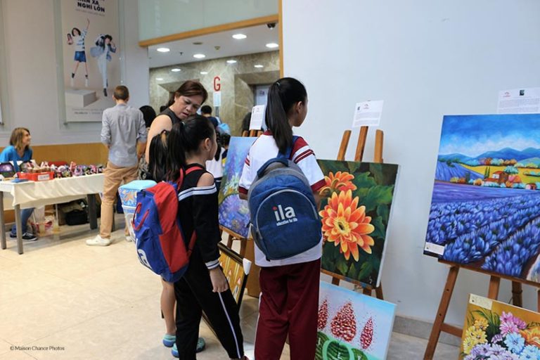 Khi chúng tôi vừa trưng bày xong gian hàng triển lãm tranh tại sảnh chính trung tâm Anh ngữ ILA đường Nguyễn Đình Chiểu Quận 1 thì đã có một bức tranh được bán. Các sản phẩm tham gia triển lãm ngày 17 và 18 tháng 9 bao gồm thú nhồi bông, móc chìa khoá, sô-cô-la và bánh quy từ xưởng bánh Làng May Mắn cùng các tác phẩm tranh do những hoạ sĩ tài năng của Nhà May Mắn như anh Chiến, anh Dương, anh Phong và anh Trần.